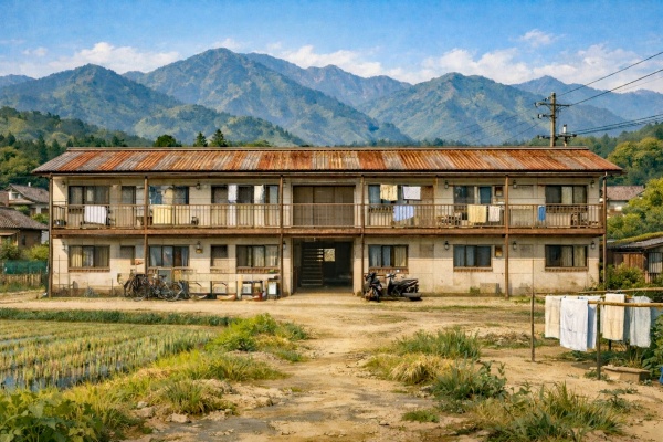 駅から外に出ると、50メートルくらい続く道路の左右に、八百屋、魚屋、雑貨店、食堂が並んでいて、その先は、田んぼとアパートが点在するだけだった。「大根荘」は10分ほど歩いた所にあったが、建物のうしろは高台になっており、道はそこから長い階段になっていた。アパートは2階建で、36部屋がある横に長い建物だった。あとからわかったことだが、辺りには狸が出没した。それほど長閑な所であった。アパートからは丹沢の山々が見渡せた。